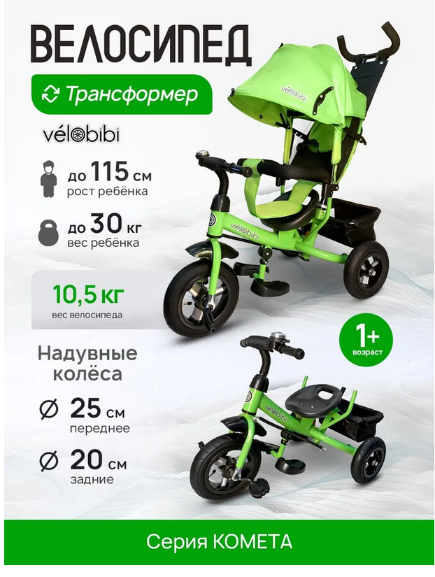 Велосипед трёхколесный с ручкой КОМЕТА (колеса надув. 10"/8" корзина) зеленый (арт. ВЛ-5063)