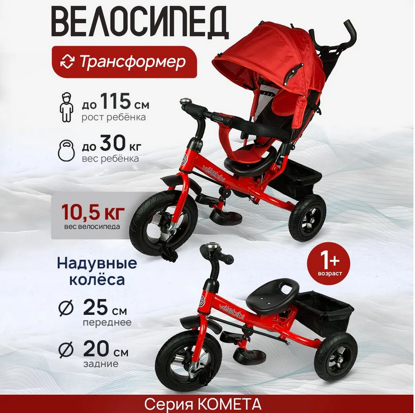 Велосипед трёхколесный с ручкой КОМЕТА (колеса надув.10"/8" корзина) красный (Арт ВЛ-0874)