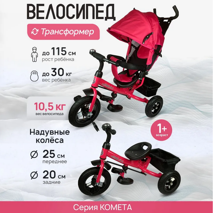 Велосипед трёхколесный с ручкой КОМЕТА (колеса надув. 10"/8" корзина) розовый (Арт ВЛ-0875)