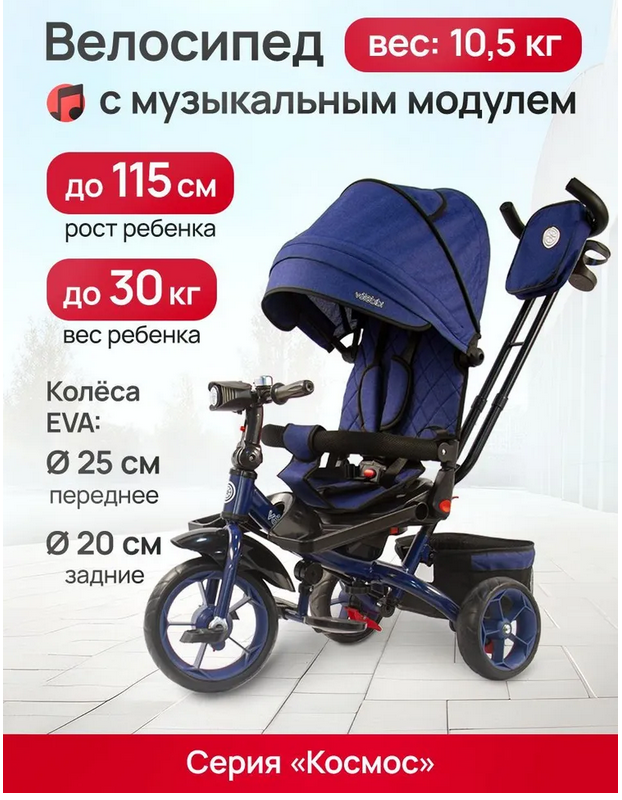 Велосипед трёхколесный с ручкой КОСМОС (колеса EVA 10"/8" поворот. сиденье) синий (Арт.ВЛ-3969) ЧЗ