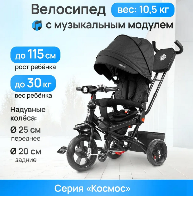 Велосипед трёхколесный с ручкой КОСМОС (колеса EVA 10"/8" поворот. сиденье) черный (Арт.ВЛ-3968)