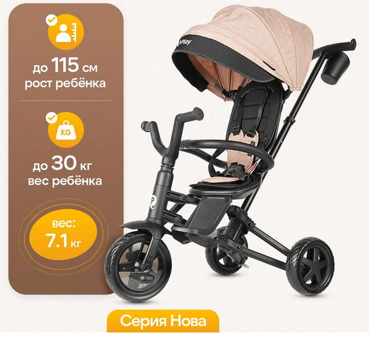 Велосипед трёхколесный с ручкой NOVA (колеса EVA 8.5"/7.5" складной) бежевый (арт.S700-14-Beige)