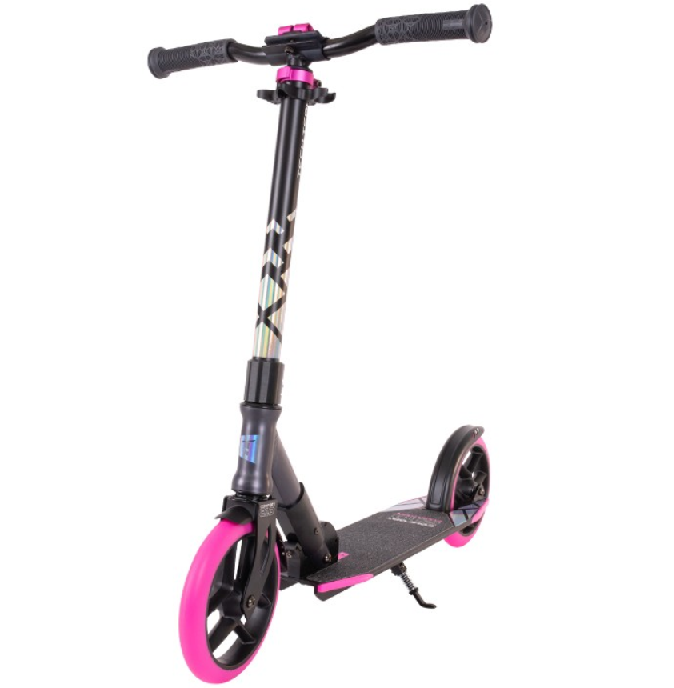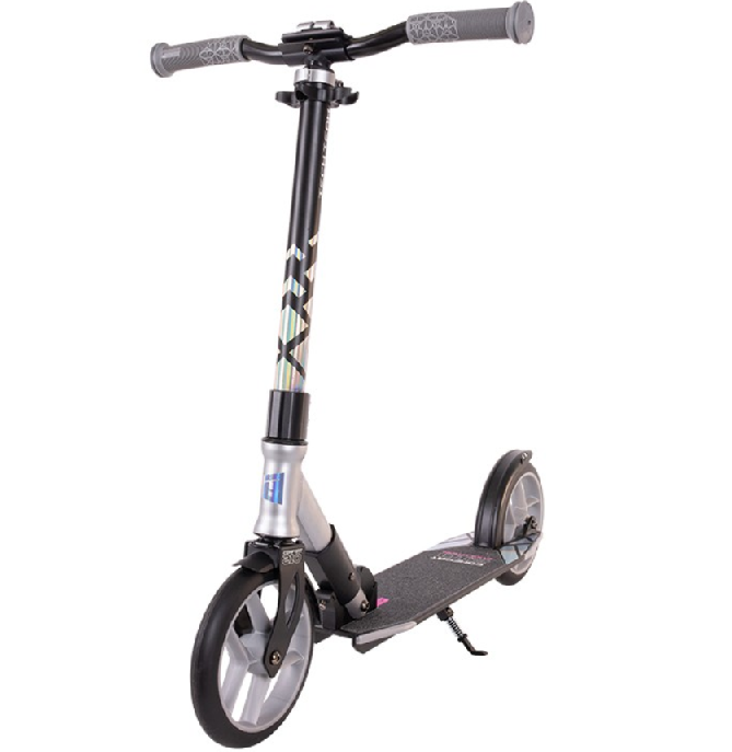 На самокате предусмотрена возможность крепления ремешка для переноски. На выбор покупателя предлагается четыре расцветки с голографическими наклейками.
