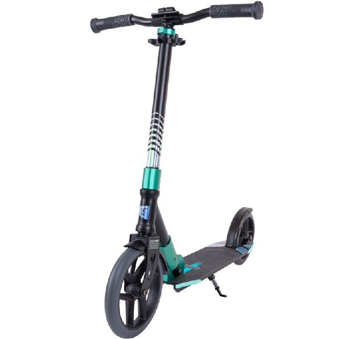 На самокате предусмотрена возможность крепления ремешка для переноски. На выбор покупателя предлагается четыре расцветки с голографическими наклейками.