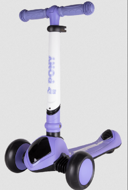 Самокат представлен в четырех цветовых решениях - черный с желтыми элементами, синем, фиолетовом и, специально для девочек - белом с розовыми элементами.