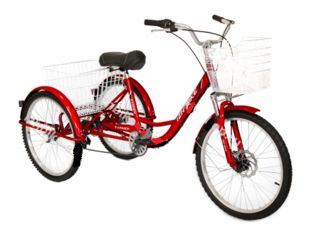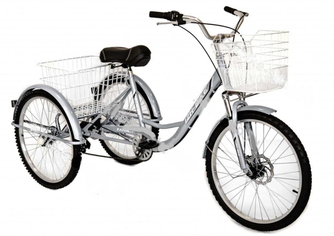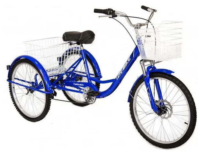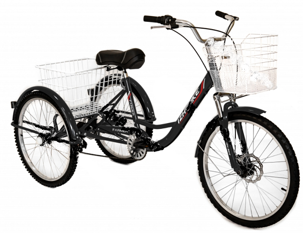 Очень удобный и устойчивый трехколесный велосипед (трайк) для взрослых с тремя полноценными колесами. Трёхколесный велосипед для взрослых IZH-BIKE Farmer (Фермер) имеет две вместительные грузовые корзины, высокую грузоподъемность (стальная рама) и 6 скоростей для комфортной езды. Отлично подойдет для велосипедистов высокого роста.